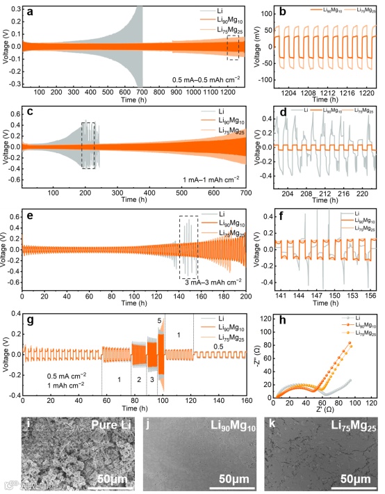 图3 a, c, e)对称电池在a)0.5 mA cm-2 和 0.5 mAh cm-2,c)1 mA cm-2 和 1 mAh cm-2 和 e) 3 mA cm-2 和 3 mAh cm-2 时的电压-时间曲线。b,d,f) b) 图a)在1201-1222 h的放大图,d)图c)在201-223 h的放大图和f) 图e)在140-157 h的放大图。g)1 mAh cm-2下不同电流密度对称电池的电压曲线。h)倍率循环后对称电池的EIS曲线。i-k)循环后电极的SEM图像:i)锂金属,j)Li90Mg10和k)Li75Mg25对称电池在1 mA cm-2 和1 mAh cm-2下400小时后。
