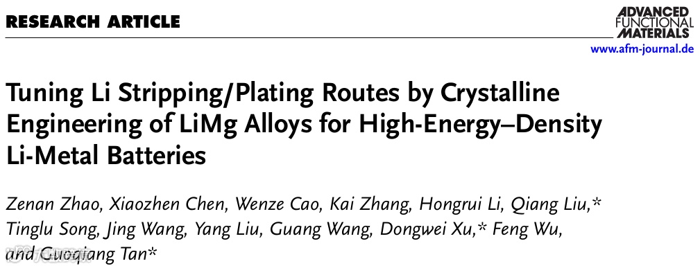 北京理工大学吴锋院士-谭国强教授团队联合华中科技大学徐东伟副教授、天齐锂业刘强高级工程师于国际著名期刊《Advanced Functional Materials》刊载了题为 “Tuning Li Stripping/Plating Routes by Crystalline Engineering of LiMg Alloys for High-Energy–Density Li-Metal Batteries” 的学术论文。本文系统地研究了LiMg合金的电化学锂剥离/嵌入行为,以及它们在锂硫电池和锂氧电池中的电化学性能。深入探索了α-LiMg和β-LiMg之间的晶体转变,并进行了理论计算,验证了α-LiMg对锂离子的高吸附能和低扩散能势垒,促进了快速电荷转移和反应动力学,从而提供了稳定均匀的锂沉积/剥离形貌,且不会形成锂枝晶和死锂。此外,该研究还进行了表面结构分析,探究了锂硫电池和锂氧电池中LiMg合金负极的SEI成分,揭示了Mg元素在稳定界面和促进形成均匀的SEI层的积极作用。系统地揭示了LiMg合金负极的相变诱导调节机制,并证明了它们增强的结构、化学和电学性能,便于锂离子沉积和传输。LiMg合金负极的最佳组成和结构可以在高能量密度锂金属电池中实现有前途的电化学性能。