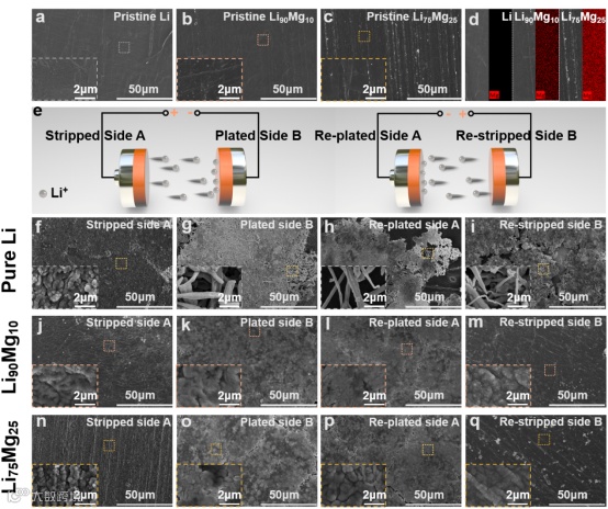 图2 a–c)原始a)纯锂,b)Li90Mg10,和c)Li75Mg25。d)纯Li、Li90Mg10和Li75Mg25的Mg元素映射图像。e)可逆Li剥离/电镀实验示意图。f-q)对称电池中f,j,n)剥离面A、g, k, o)电镀面B、h, l, p)重新电镀的A面和i, m, q)重新剥离的B面的SEM图像,分别使用f-i)纯Li、j-m)Li90Mg10和n-q)Li75Mg25。锂剥离/电镀在3 mA cm-2和1 mAh cm-2下进行。