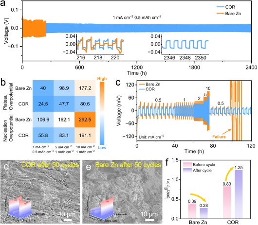 基于此,东北大学冶金学院李犁教授团队提出了一种基于杂化界面工程的预腐蚀策略,通过在锌箔表面原位构建由氢氧化铝薄层与高暴露特定晶面协同构筑的杂化界面电极(COR),以实现超稳定锌金属电池。具有亲锌性和亲水性的界面层降低了成核过电位和脱溶剂化势垒,确保了快速的 Zn2+迁移动力学。蚀刻后高暴露的Zn (002) 晶面诱导了沉积物的优势晶面取向,抑制了枝晶生长。因此,COR电极在1 mA cm−2电流密度下循环寿命超过2400 h,即使在10 mA cm−2电流密度下仍可实现超1800 h稳定循环。此外,与MnO2正极组装的COR||MnO2全电池在1 A g−1电流密度下循环1800圈后容量保持率达 97.5%,同时相应的软包电池也展现了出色的循环稳定性。本工作为高稳定性锌金属负极的开发提供了一种简便、经济高效且具备可规模化生产潜力的策略。