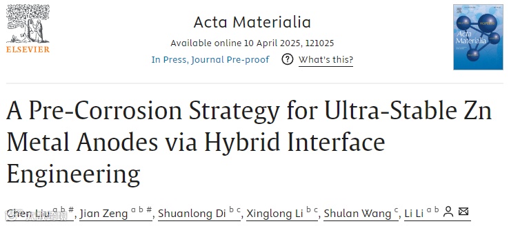 Chen Liu, Jian Zeng, Shuanlong Di, Xinglong Li, Shulan Wang, Li Li, A Pre-Corrosion Strategy for Ultra-Stable Zn Metal Anodes via Hybrid Interface Engineering, Acta Materialia 2025, 121025.