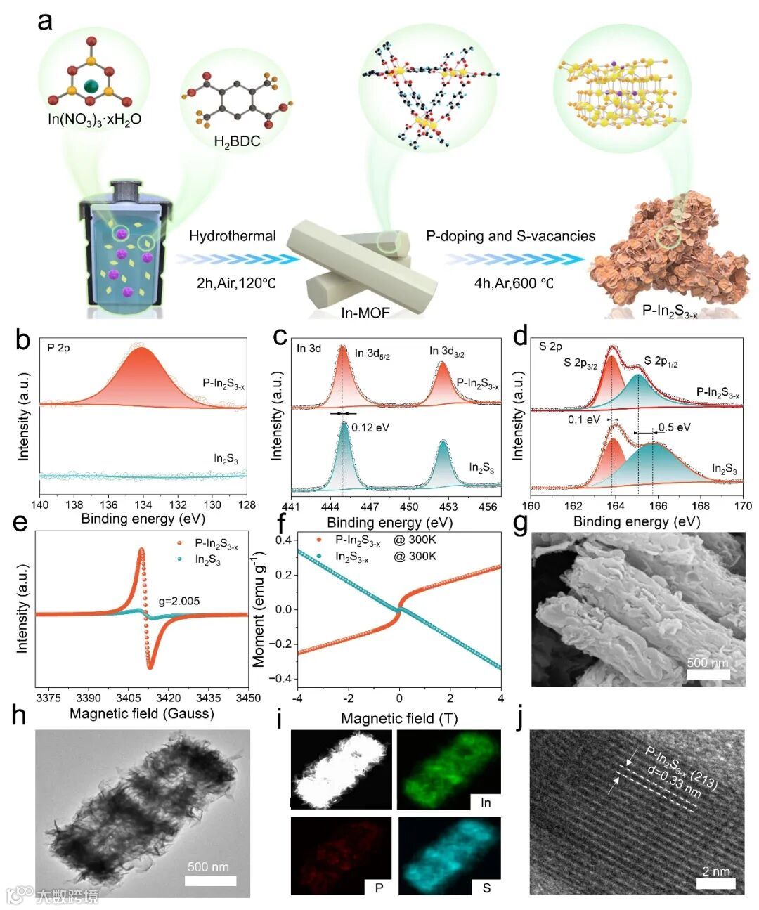 本研究通过多步反应成功制备了磷掺杂非对称配位In₂S₃材料(P-In₂S₃₋ₓ)。系统表征表明,磷掺杂显著改变了材料的电子结构特征,XPS分析证实了电子结构的重构,结合EPR和SQUID测试结果,明确检测到材料中In元素存在高自旋电子态,成功实现了通过磷掺杂调控In₂S₃电子态的目标(图2)。