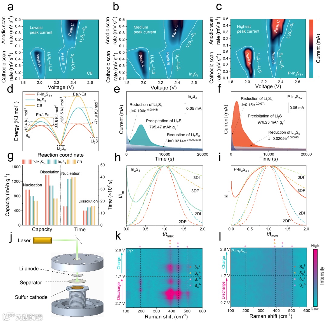 在1.8 ~ 2.7 V电压范围内,用循环伏安法(CV)研究了扫描速率为0.1 mV s-1 ~ 0.5 mV s-1的硫还原动力学。使用P-In2S3-x催化剂的电池比使用In2S3催化剂和CB的电池具有更高的电流响应表明其优秀的催化能力。Li2S沉淀和溶解实验观察到P-In2S3-x电池的Li2S成核容量最高,为973.23 mAh g-1,电流响应时间最早,为158s,高于In2S3电池(785.47 mAh g-1, 3778 s),直接地观察了P-In2S3-x催化剂对Li2S的催化能力。此外,在有P-In2S3-x催化剂和不含P-In2S3-x催化剂的情况下,LiPSs在硫转化过程中的演化也得到拉曼光谱的证实。在P-In2S3-x催化剂的电池中没有明显的LiPSs特征信号,表明该P-In2S3-x催化剂具有优越的LiPSs阻断能力。正是由于具有高电子自旋态的P-In2S3-x催化剂对LiPSs具有合理的吸附和催化能力,从而加速了LiPSs的转化,抑制了“穿梭效应”(图4)。