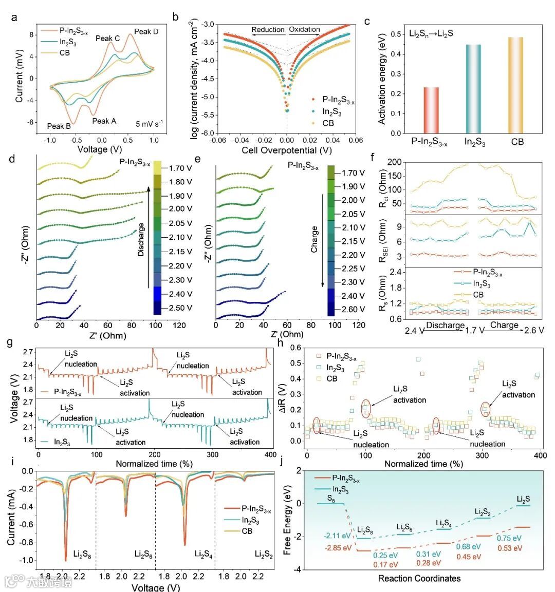 对称电池CV测试显示,P-In₂S₃₋ₓ组具有更大的氧化还原电流和更低的电压极化,证实其优越的电化学动力学特性。原位EIS分析表明,该催化剂体系具有最小的电荷转移电阻(Rct),显著提升了硫氧化还原动力学。GITT测试进一步揭示,特别是在Li₂S成核阶段,P-In₂S₃₋ₓ组表现出最小的内阻变化(ΔRinternal),验证了其对硫氧化还原反应的显著促进作用。结合LSV测试和吉布斯自由能计算结果,证实P-In₂S₃₋ₓ为硫氧化还原反应提供了理想的热力学环境,有效促进了多硫化物的逐步转化(图5)。