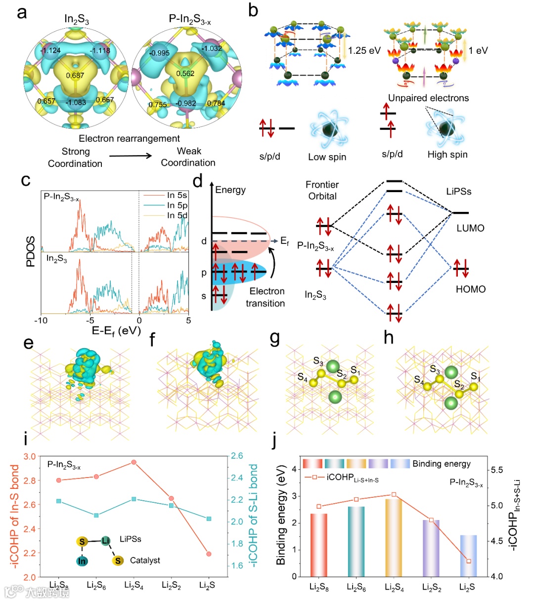 锂硫(Li-S)电池因其拥有高理论能量密度(2600Wh kg-1)、天然储备丰富、硫的生态友好性和低成本而成为有前途的下一代储能系统。然而,锂硫电池中硫还原反应(SRR)电化学动力学缓慢导致的可溶性多硫化物锂(LiPSs)的“穿梭效应”严重影响了电池的性能和耐久性,这严重限制了锂硫电池的大规模实际应用。为了促进锂硫电池的研究和发展,本文通过配位工程,利用P掺杂和硫空位制备了非对称配位的三硫化二铟(P-In2S3-x)。系统地综述了P掺杂及S空位p区金属硫化物电子自旋形态的改变,详细分析了配位作用对轨道杂化的影响规律,以及相应的催化机制,这项工作为硫还原反应中p区金属的电子行为和轨道相互作用提供了见解,为设计高性能锂硫电池的p区金属催化剂提供了途径。