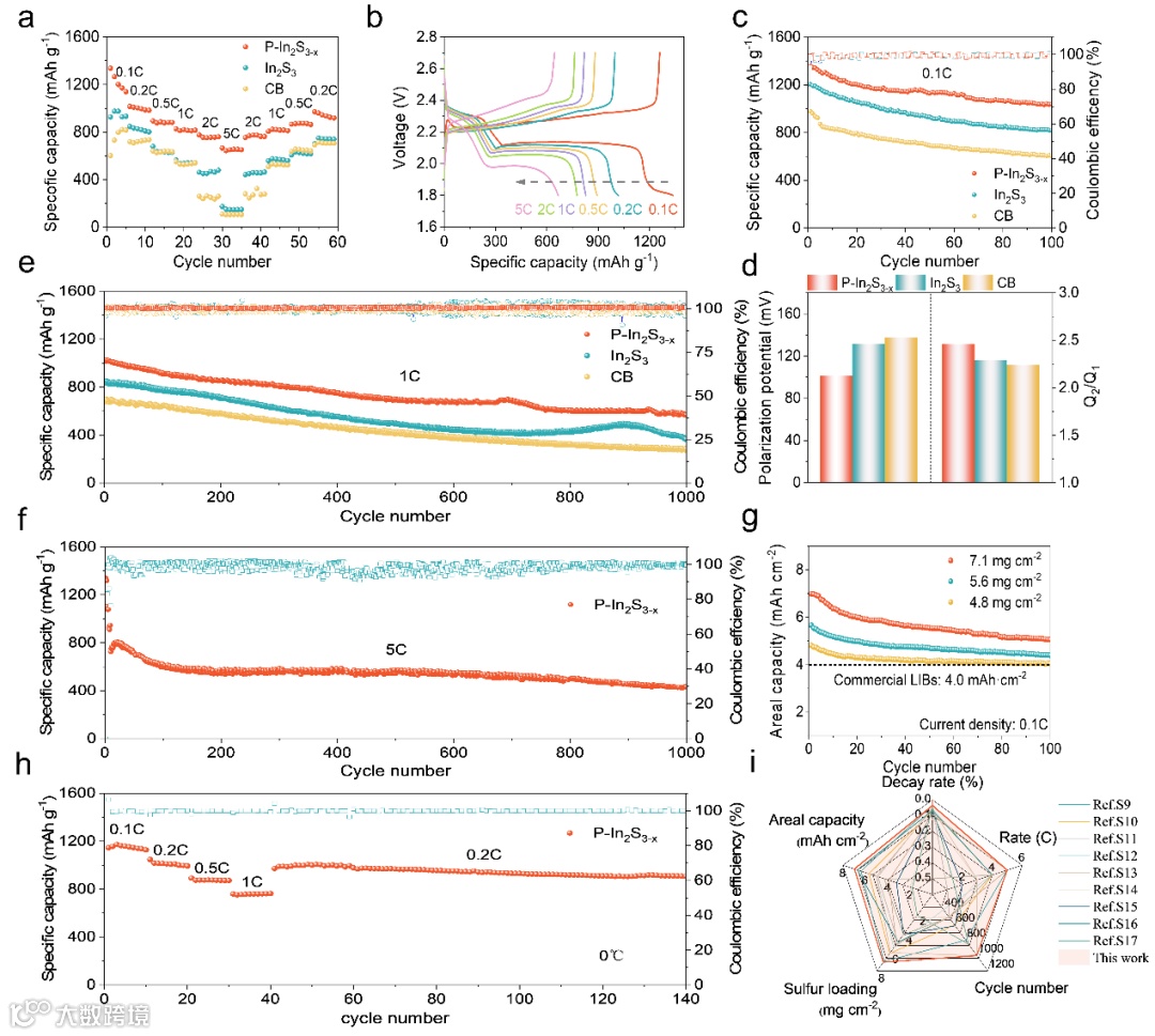 用P-In2S3-x催化剂的电池在0.1 C、0.2 C、0.5 C、1 C、2 C和5 C下的放电容量分别为1336.7、1016.5、893.8、827.6、775.9和665.9 mAh g-1;在1C时的容量高达1029.1 mAh g-1,并且在1000次循环后保持571.1 mAh g-1的容量,其容量衰减率为0.045%;在5C高电流密度1000次循环后,可获得809.6 mAh g-1的高初始容量和432.9 mAh g-1的可逆容量;当硫负荷分别为4.7、5.6和7.1 mg cm-2时,可获得4.74、5.54和6.97 mAh cm-2的初始容量和4.07、4.47、5.08 mAh cm-2的100次循环可逆容量;在0℃极端条件下,P-In2S3-x催化剂的电池在0.1 C、0.2 C、0.5 C和1 C时的容量分别为1172.8、1047.4、891.7和760 mAh g-1。