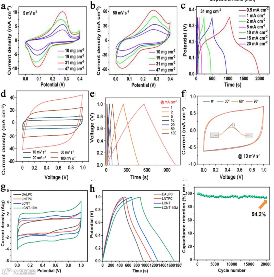 图 6不同碳纳米管复合材料电化学性能曲线图:(a, b)简历(循环伏安法)曲线的3 d印刷CT-SWNT-NiCo2O4电极5和50 mV年代1,(c)肾小球囊性肾病的NiCo2O4加载曲线31毫克cm-2。(d)简历曲线3 d印制S-CNT / GNS msc测量从10 mV−1到100 mV年代−1,(e)肾小球囊性肾病S-CNT / GNS msc在电流密度曲线马1到100厘米−2 (f)简历曲线S-CNT / GNS msc在不同弯曲度,(g)简历LCNT-10M曲线的扫描速度10 mV s−1,(h)肾小球囊性肾病LCNT-10M曲线电流密度为0.5 a / g,(i) LCNT-10M在10 A/g电流密度下的循环稳定性