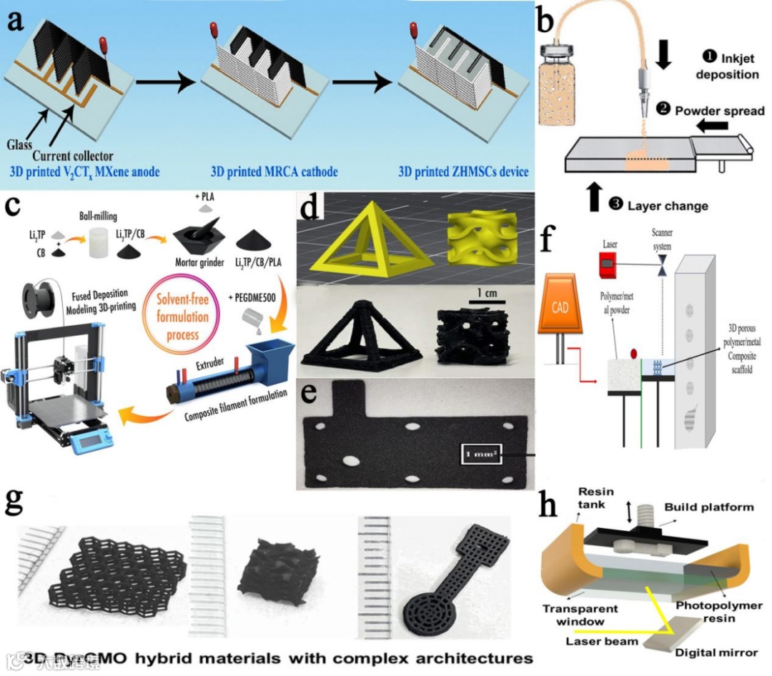 图 5 3D打印技术在储能领域的应用:3D打印技术与器件:(a)使用DIW打印的zhmsc-4器件示意图,(b)BIJ打印工艺示意图,(c)无溶剂制造和FDM 3D打印工艺,(d)PLA:Li2TP:CB:PEGDME500(重量百分比40:40:10:10)三维复合电极结构设计(上)和3D打印(下)PLA:Li2TP:CB:PEGDME500(重量百分比40:40:10:10)3D打印石墨/尼龙电极数字图像,(f)与计算机辅助设计软件连接的3D- sls机器的工作机制包括几个步骤,(g)不同几何形状的3D PyrCMO杂化电极的数字照片,(h)SLA 3D打印程序,生成可热解光聚合物树脂的3D独立网状结构。