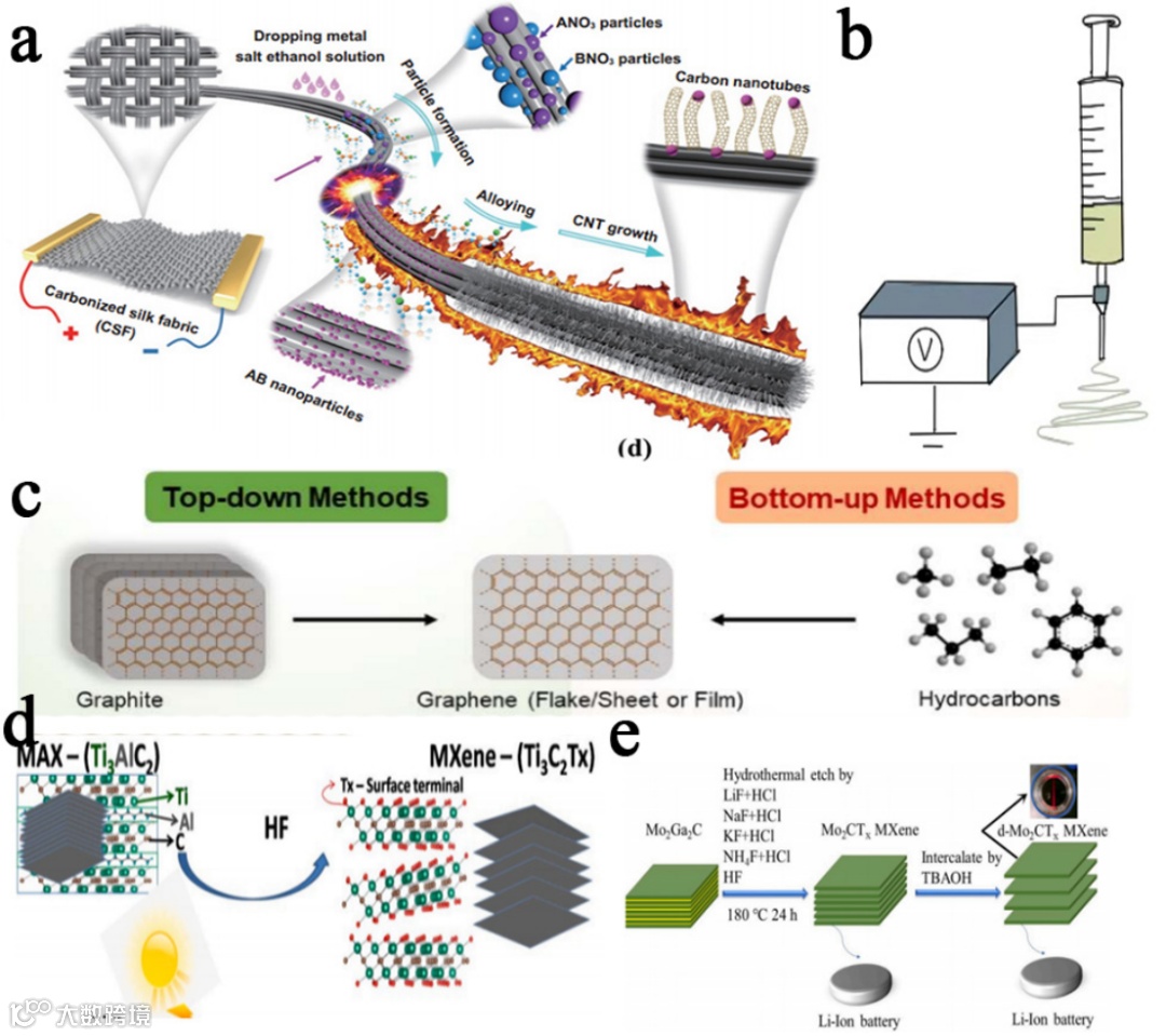 图 4 纳米材料的制备方法:(a)碳纳米管在碳化真丝织物上生长的碳热冲击法,(b)静电纺丝法制备碳纳米管(c)石墨烯合成原理图的自上而下方法和自下而上方法,(d) MXene合成原理图的自上而下方法和(e)自下而上方法。