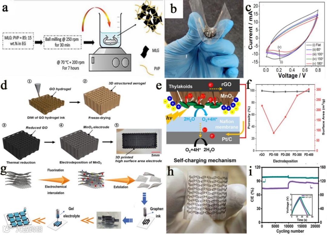图 8石墨烯电极的制备、电化学性能及照片:(a)可3D打印的MLG-ink的合成方案,(b)折叠的3D打印实用超级电容器图像,(c)原始MLG-ink在不同折叠角度下的3D打印交叉指电极CV曲线,(d) 3D打印MG电极的制作工艺示意图,(e) PE收集和自充电机理。(f) MnO2沉积的G电极和MG电极的孔隙率和比表面积,(G)制备EG-MIMSCs的示意图,(h)弯曲和折叠的EG-MSC的照片,(i)在80至100°C, 1.6 A cm−3下进行20000次循环的EG-MSC -2-1的循环稳定性。