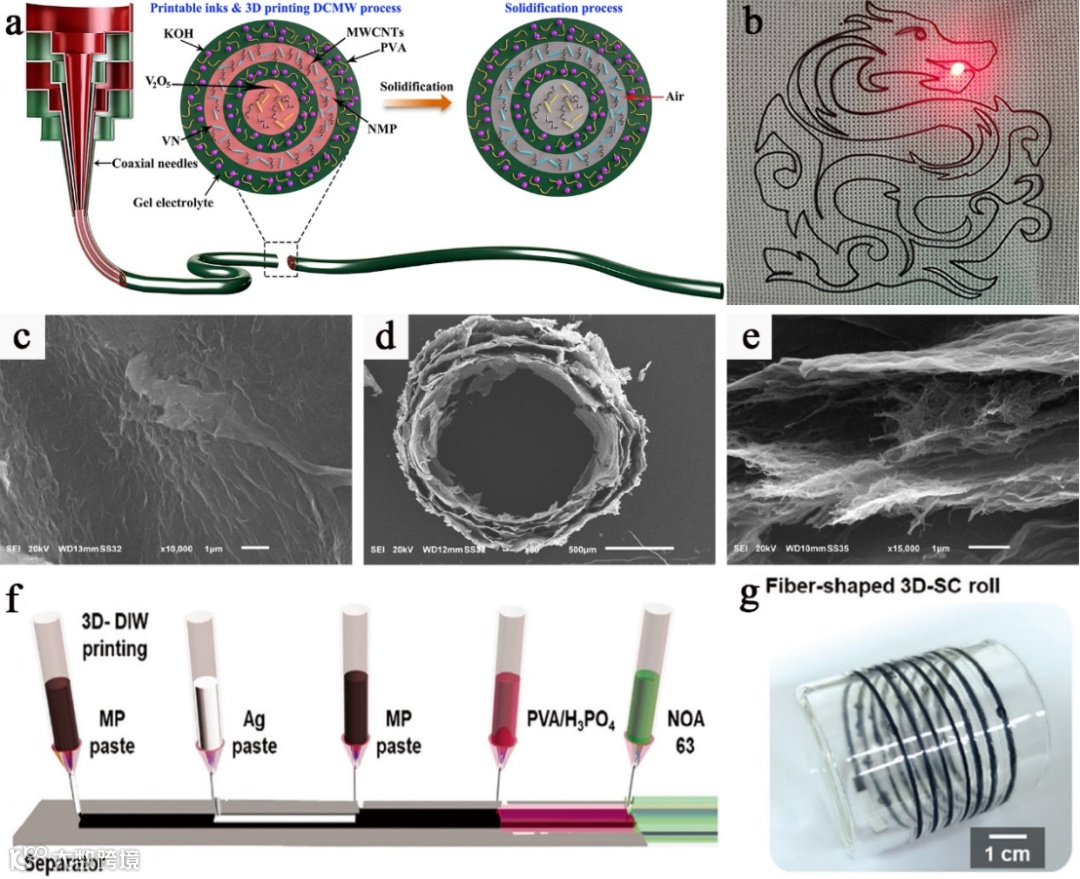 图 10石墨烯电极的制备、电化学性能和形貌表征:(a)可打印同轴FASC器件的制作工艺示意图,(b)充满电的3D打印同轴FASC器件照射1.5 v红色LED的照片,(c) GMHT1.0-8-2的表面SEM图像,(d,e) GMHT1.0-8-2的截面SEM图像,(f)分离器顶部纤维形3D- sc电极的单流3D- diw打印,(g)缠绕在滚筒上的3D-SC纤维。