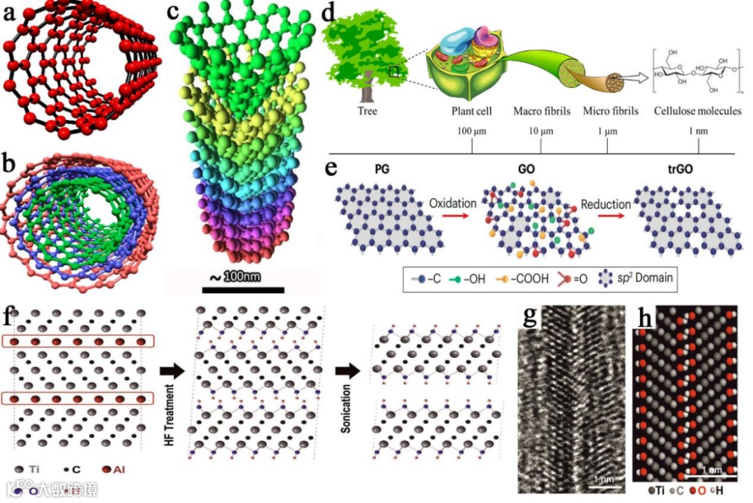 图 3纳米材料结构及表征图像:(a)单壁碳纳米管的表面和内部视图,(b)多壁碳纳米管,(c)植物或树木中含有的纤维素具有从米级到纳米级的分层结构,(d)碳纳米纤维结构示意图,(e)原始石墨烯(PG),氧化石墨烯(GO)和完全还原氧化石墨烯(trGO)结构的示意图比较,(f) Ti3AlC2制备各个阶段的结构示意图。(g, h) MXenes层状结构的原子模型。