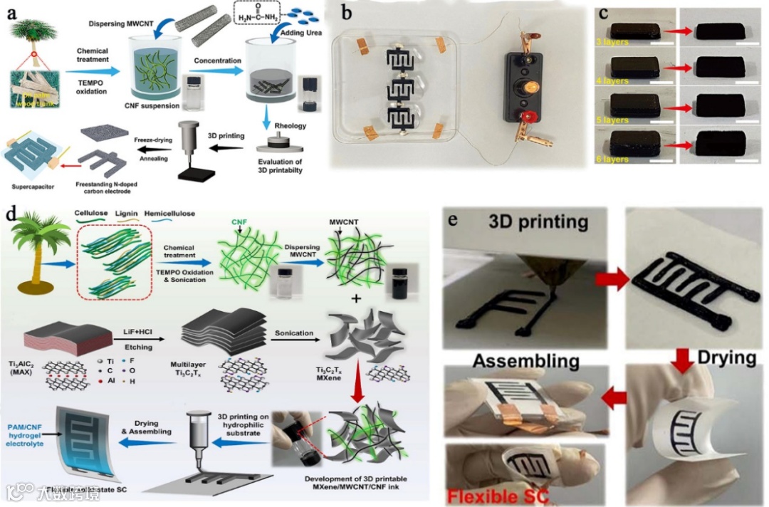 图 9 基于3D打印技术的数字间电极设计与装置:(a)使用CNFs、MWCNTs和尿素制备凝胶墨水的示意图,以及使用两个3d打印的氮掺杂碳电极,(b)由三个准固态对称超级电容器组成的串联装置可以点亮一个小球形灯泡,(c)冷冻干燥和退火处理前后不同层数的印刷块的数字图像。(d)制备可3D打印的MXene/CNF/MWCNT凝胶油墨和制造FSC器件的3D打印工艺示意图,(e)详细制作工艺图片。