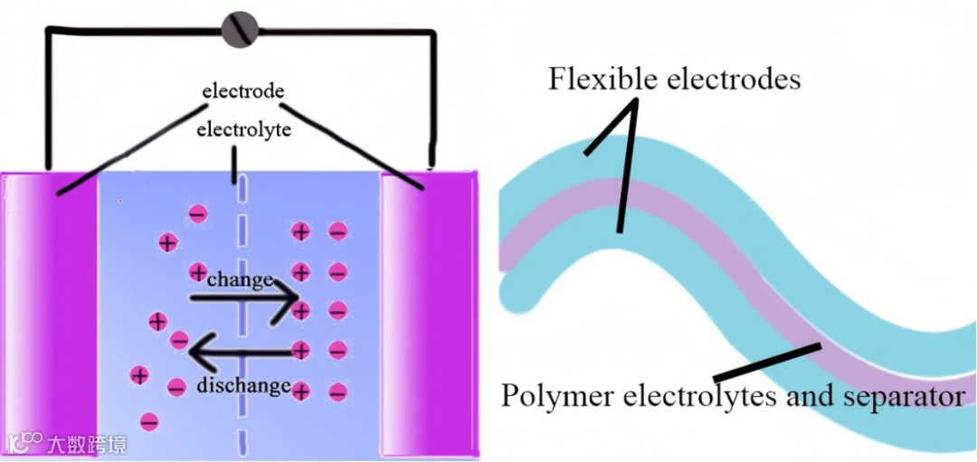 图 1 超级电容器机理示意图(左)和柔性电极示意图(右)