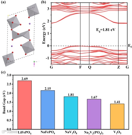 图2. NaV3O8的(a)晶体结构示意图(紫色、灰色、红色圆球分别代表Na、V、O原子)与 (b)能带结构图;(c)NaV3O8与典型正极材料的带隙对比。