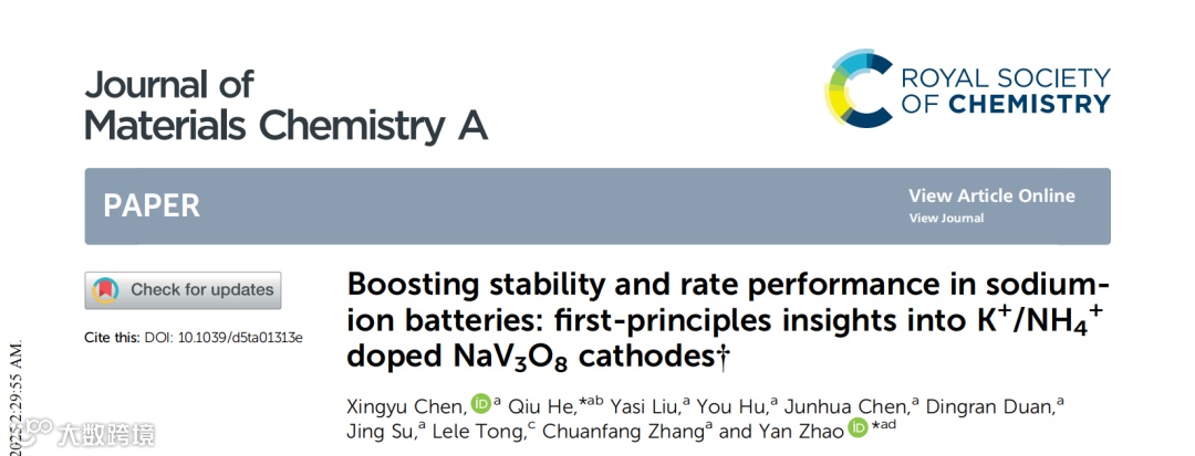 基于此,来自四川大学的赵焱教授携手何秋博士后,在国际知名期刊Journal of Materials Chemistry A上发表题为“Boosting stability and rate performance in sodium-ion batteries: first-principles insights into K+/NH4+ doped NaV3O8 cathodes”的研究性论文。该论文基于第一性原理计算,系统研究了NaV3O8正极材料的储能机制,并揭示了K+和NH4+掺杂对其结构稳定性与倍率性能的协同增强效应。