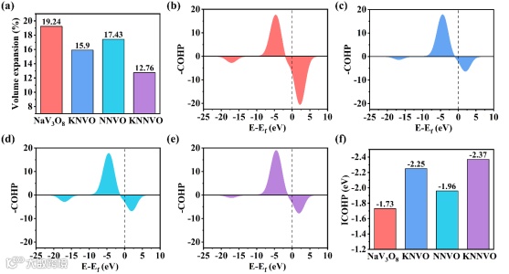 图6.(a)掺杂体系在充放电过程中的体积变化率;(b–e)原始NaV3O8中V–O 键的COHP分析;(d–e)K+和NH4+单掺杂及共掺杂NaV3O8体系的V–O 键的COHP分析;(f)掺杂前后V–O 键的ICOHP值的对比图。