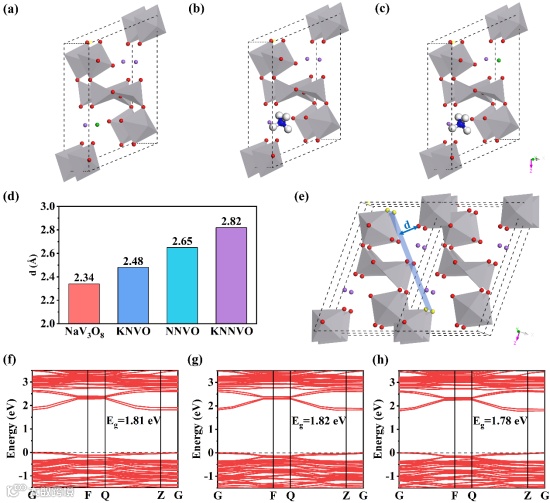图4.(a–c)K+和NH4+单掺杂及共掺杂NaV3O8的晶体结构示意图(绿色、蓝色、白色球体分别代表K、N、H原子);(d)掺杂前后[V3O8]−层间距对比图;(e)NaV3O8中[V3O8]−层间距的示意图;(f–h)K+和NH4+单掺杂及共掺杂NaV3O8的能带结构图。