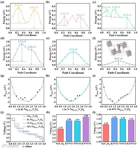 图5. (a–c)嵌入Na+在K+/NH4+单掺杂及共掺杂NaV3O8中的扩散能垒;(d–f)K+、NH4+及Li+分别在各自掺杂体系中的扩散能垒;(g–i)Na+嵌入K+/NH4+单掺杂及共掺杂体系中能量凸胞图;(j–l)掺杂前后NaV3O8的开路电压、初始电压及平均电压变化。