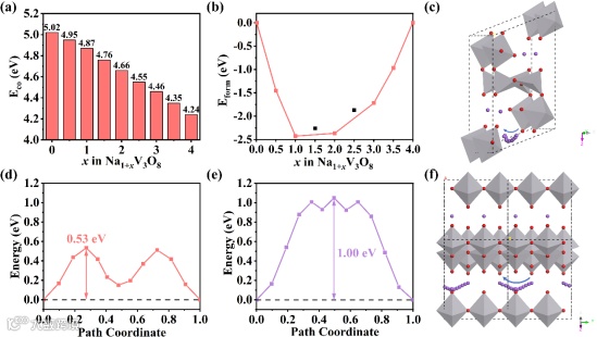 图3. (a)Na1+xV3O8的内聚能;(b)Na+嵌入NaV3O8 的形成能凸胞图; “嵌入Na+”在NaV3O8中的(c)扩散路径和(d)扩散能垒;“结构Na+”在NaV3O8中的(e)扩散能垒和(f)扩散路径。