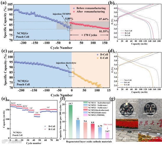 图5:(a)-(b) 修复前后NCM||Gr袋式电池的循环性能和充放电曲线;(c)-(d) 注入电解液前后袋式电池的循环性能对比;(e) 修复前后袋式电池的倍率性能;(f) 修复后袋式电池的容量衰减率与文献报道的对比;(g) 修复后袋式电池在无人机上的实际应用照片。