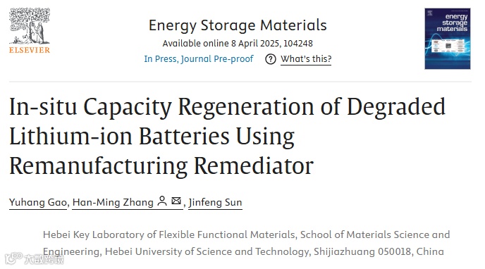 基于此,河北科技大学的张晗明老师,在国际知名期刊ESM上发表题为“In-situ capacity regeneration of degraded lithium-ion batteries using remanufacturing remediator”的研究文章。研究表明,废旧锂离子电池的主要退化机制是活性锂的损失,这其中包括锂枝晶和“死锂”(统称为Li0)的形成。这些Li0不仅降低了电池容量,还阻碍了锂离子的传输。基于此,作者提出了一种基于2,2,6,6-四甲基哌啶氮氧化物(TEMPO)修复剂的原位再制造策略(TRIISR),用于修复废旧锂离子电池。该策略通过激活电池内部的Li0,将其转化为活性锂离子(Li⁺),从而补充电池中活性锂损失。此外,TEMPO还能诱导形成富含LiF的SEI膜,显著提高电池的离子传输效率和循环稳定性。实验表明,经过TRIISR修复的商业袋式电池容量恢复率达5.89%,使用寿命延长70%。这种策略不仅操作简单、成本低廉,还具有显著的环境友好性和技术经济优势,为废旧锂离子电池的二次利用提供了新思路。