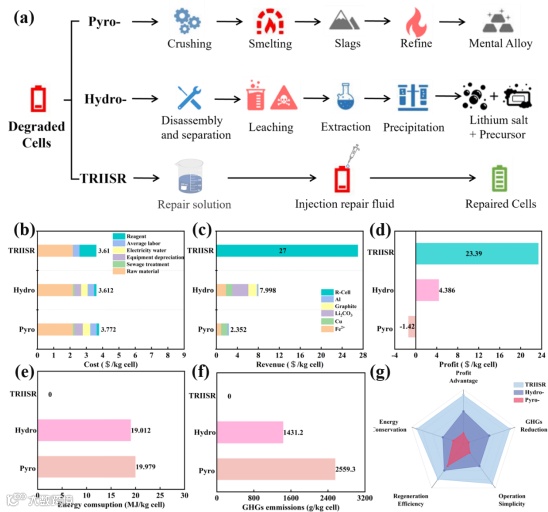 图7:(a)火法冶金、湿法冶金与TRIISR策略的路线示意图;火法冶金、湿法冶金和TRIISR回收的退役NCM电池的(b)成本(c)收入(d)利润;不同回收过程的(e)能耗和(f)温室气体排放;(g)TRIISR与火法冶金和湿法冶金的综合比较
