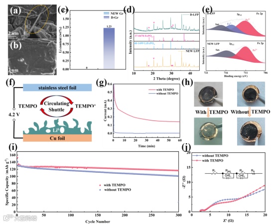图2:(a)-(c) 废旧石墨负极的SEM图像和锂含量测试;(d)-(e) 废旧LiFePO₄正极的XRD和XPS分析;(f)-(h) 验证TEMPO修复剂激活“死锂”的实验设计及结果;(i)-(j) LFP||Gr电池的循环性能和电化学阻抗谱(EIS)对比。