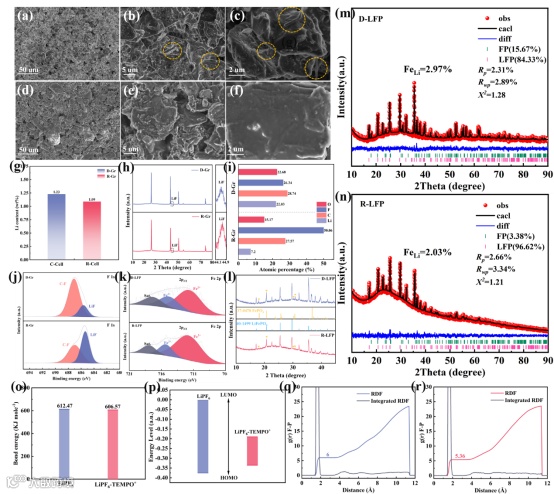 通过TEMPO修复液再制造容量衰减至80%-85%的退役LFP||石墨扣式电池,实现了有效的性能恢复。电化学测试表明,R-Cell容量显著提升,从84.98%提高到89.51%,且循环稳定性优于D-Cell。通过EIS和dQ/dV测试,发现TEMPO修复液有效减少了电池的极化和内阻,提升了反应动力学。通过SEM、XRD、XPS和ICP-OES等表征手段,分析了TEMPO修复液的修复机制:负极方面,TEMPO修复液能够有效消除Li0,减少非活性锂的含量,并促进形成富LiF的稳定SEI层,从而提升锂离子的传导性;正极方面,被TEMPO激活的锂离子,补充到正极材料的缺锂晶格中,减少缺锂相FePO4的含量(29.6%→19.4%),并降低Li/Fe反位缺陷(2.97%→2.03%),优化了正极的电化学性能。