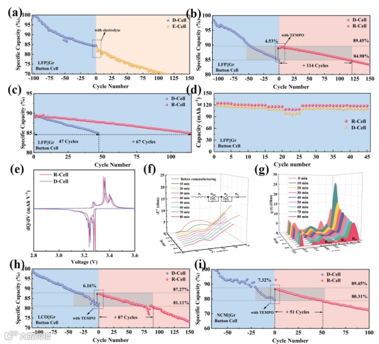 图3:(a)-(b) 修复前后LFP||Gr扣式电池的循环性能;(c) 修复前后容量衰减率对比;(d)-(e) 修复前后电池的倍率性能和dQ/dV曲线;(f)-(g) 修复过程中电池阻抗变化的原位EIS和DRT分析;(h)-(i) 修复前后LCO||Gr和NCM||Gr电池的循环性能。