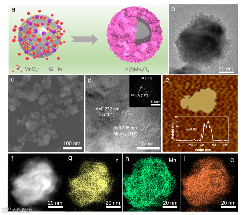 图1. a) In@Mn3O4制备示意图。b) TEM图像。c) SEM图像。d) 选区HRTEM图像和插图In@Mn3O4-5的区域电子衍射图。e) In@Mn3O4-5的AFM图像。f-i) In@Mn3O4-5中In、Mn、O对应的EDS元素映射。