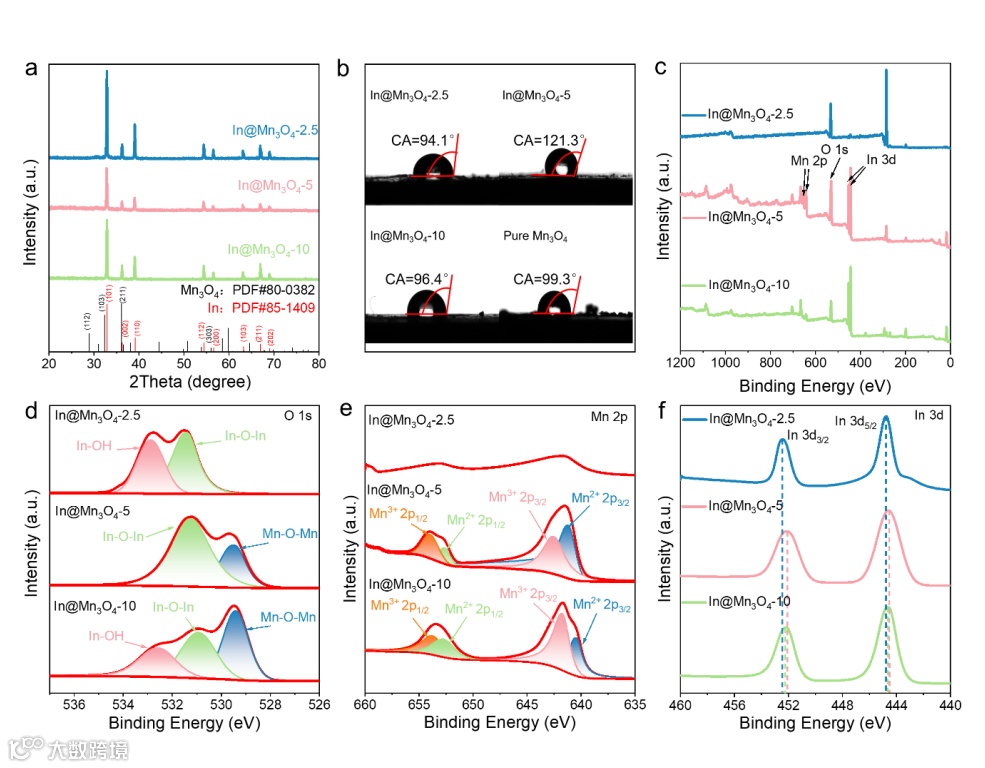 图2. a) In@Mn3O4-(2.5, 5, 10)和纯Mn3O4的XRD谱图。b) In@Mn3O4-(2.5、5和10)和纯Mn3O4的水接触角测试图。c)不同催化剂的XPS图。d) O 1s XPS光谱,e) Mn 2p XPS光谱,f) In@Mn3O4-(2.5, 5, 10)的In 3d XPS光谱。