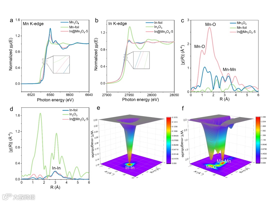图3. 归一化的a) Mn和b)在k3边缘XANES光谱。c) Mn和d) In的傅里叶变换EXAFS谱。e) In和f) Mn的EXAFS的小波变换图。