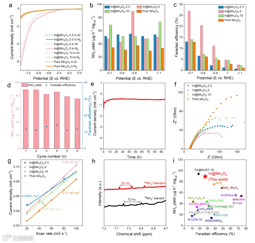 图4. a) In@Mn3O4-(2.5、5、10)和纯Mn3O4在Ar-和N2-饱和电解质中的LSV曲线。b) NH3产率和c) In@Mn3O4-(2.5, 5和10)和纯Mn3O4在不同电位下的FE。d) In@Mn3O4-5在- 0.9 V vs RHE下循环试验。e) In@Mn3O4-5 在- 0.9 V vs RHE进行96 h计时电流测试。f) 催化剂的Nyquist图。g) 电容电流密度由CV曲线与扫描速率的关系得出。h) 在In@Mn3O4-5上使用14N2和15N2原料气在−0.9 V vs RHE下进行NRR电解后的1H核磁共振谱图。i) In@Mn3O4-5的NH3产率和FE与过去两年其他工作报告的对比图。