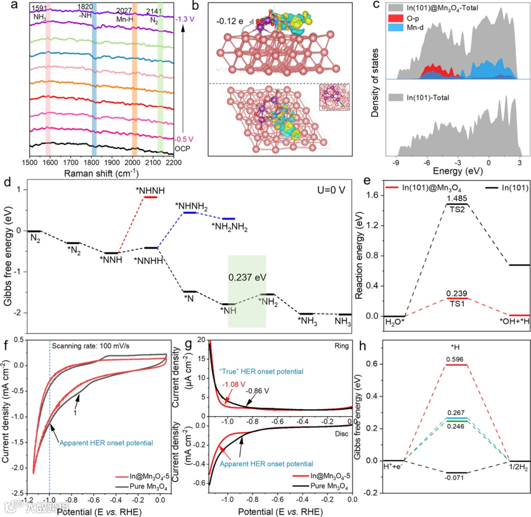 图5. a) In@Mn3O4-5原位拉曼试验。b) In@Mn3O4的计算模型和In@Mn3O4上*N2的差分电荷密度。c) In(101)@Mn3O4和In(101)模型的态密度。d) In(101)@Mn3O4上的NRR吉布斯自由能变化。e) In(101)@Mn3O4上*H2O势能解离谱。f) 扫描速率为100 mV s−1时Mn3O4和In@Mn3O4-5的CV。g) In@Mn3O4-5和Mn3O4的RRDE伏安图,转速为1600转/分,扫速为10 mV s−1。采集圆盘电极上的负极化曲线(下);而环电位保持在+1.30 V(顶部)。h) In(101)@Mn3O4上*H在不同位置的吉布斯自由能变化。