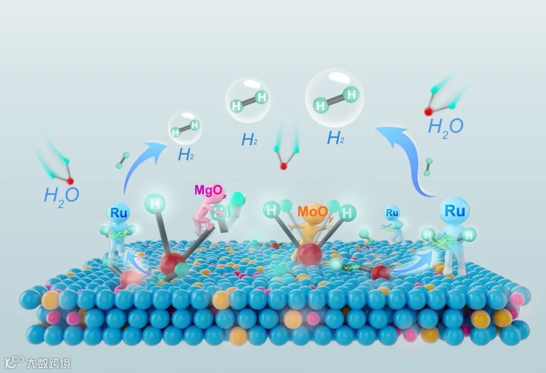 图1.非晶Ru金属烯表面MgOx/MoOy协同促进电解水析氢的反应机制。