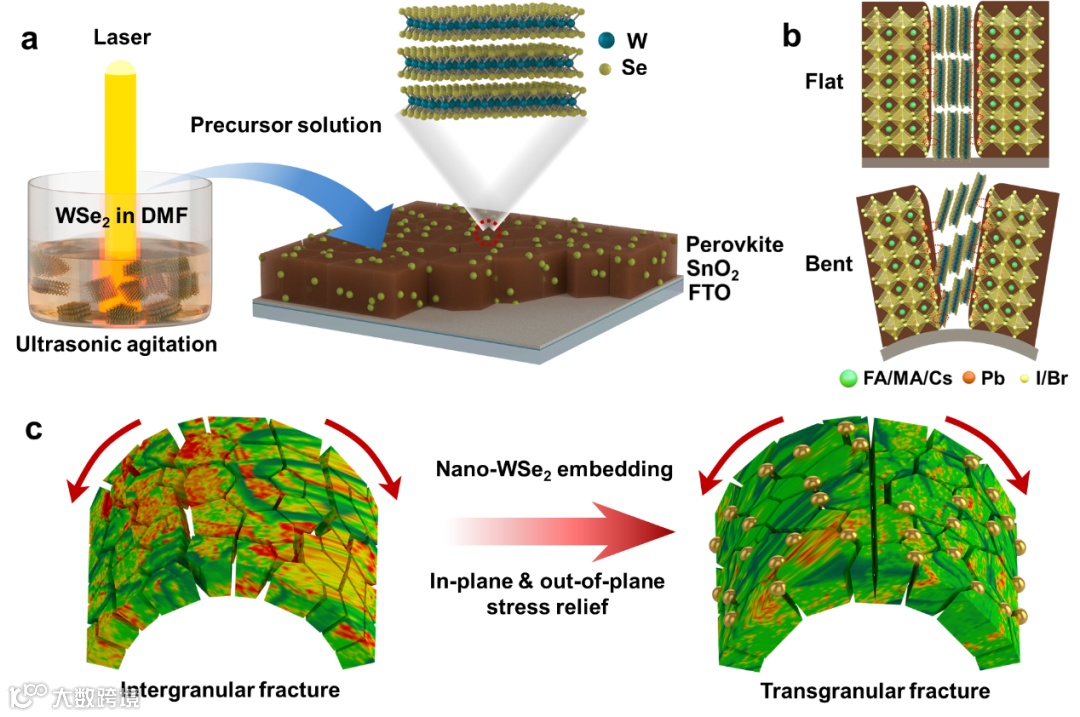 图1. nano-WSe2液相脉冲激光制备及钙钛矿薄膜应力调控作用机制示意图