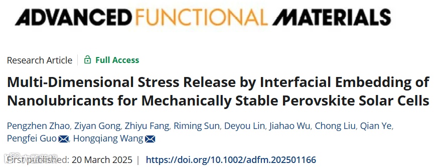 基于此,来自西北工业大学的王洪强教授与郭鹏飞博士,在国际知名期刊Advanced Functional Materials上发表题为“Multi-Dimensional Stress Release by Interfacial Embedding of Nanolubricants for Mechanically Stable Perovskite Solar Cells”的文章。该文章报道了一种通用的钙钛矿薄膜应力调控策略,将二维纳米润滑剂植入钙钛矿晶界以有效调控杂化钙钛矿薄膜中的残余应力,从而实现高效且机械稳固的钙钛矿太阳能电池。