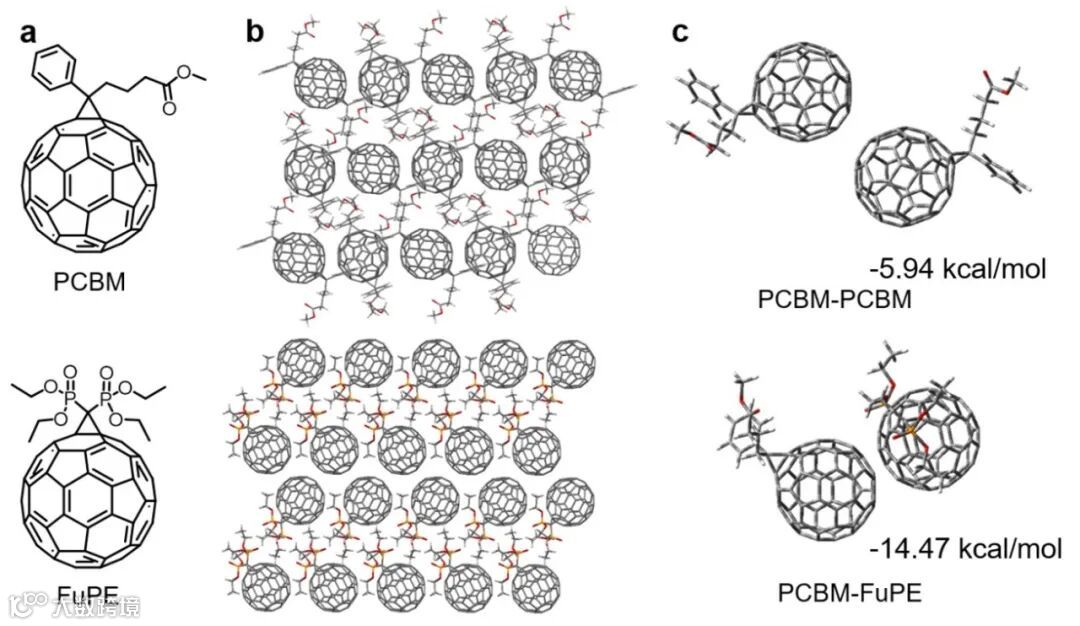 图1. a) PCBM和FuPE的化学结构,b) PCBM和FuPE晶体的分子堆积模型,c) 通过DFT计算获得的PCBM-PCBM和PCBM-FuPE的分子间相互作用