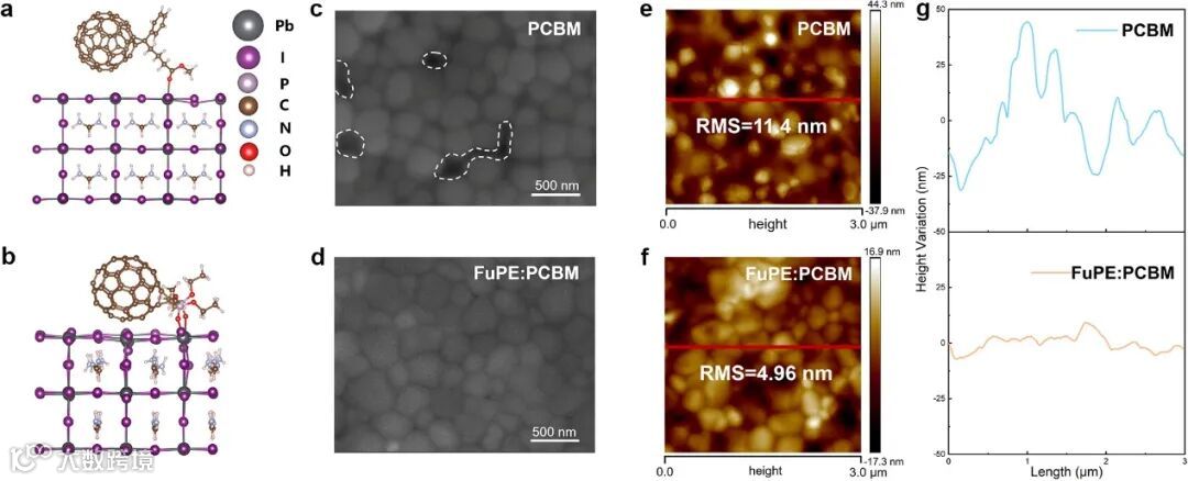 图2. a) PCBM和b) FuPE覆盖的钙钛矿薄膜的理论计算,c) 钙钛矿/PCBM和d) 钙钛矿/FuPE:PCBM薄膜的扫描电镜图,e) 钙钛矿/PCBM和f) 钙钛矿/FuPE:PCBM薄膜的AFM图,g) AFM表面形貌图对应的线性高度图
