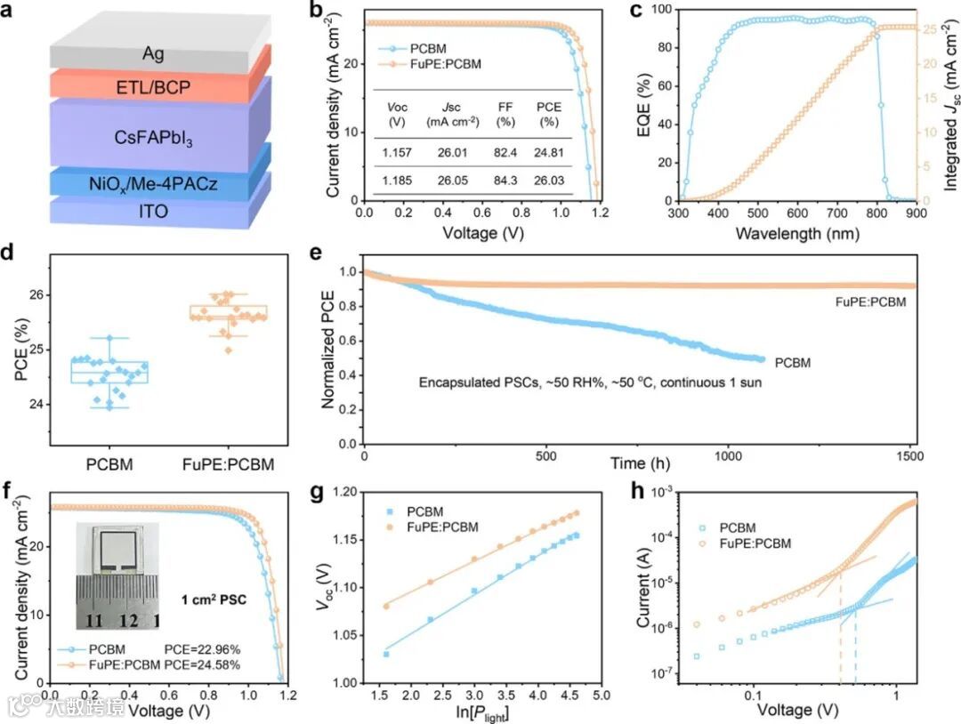 通过改性后的电子传输层拥有更优的界面接触和更低的缺陷密度使得电子迁移率显著提高,从而提升了器件的短路电流JSC。同时对钙钛矿表面缺陷的钝化抑制了界面处的陷阱辅助复合,从而提高了器件的开路电压VOC和填充因子FF。最终基于FuPE:PCBM电子传输层器件实现了超过26%的器件效率,并且具有更高的稳定性,在连续工作1500小时后仍能保持92%的出是器件效率。在1cm2的器件中仍能获得24.58%的效率,这表明这种改性方法依然适用于大面积制备的需求。这一研究不仅为解决PCBM电子传输层的自聚集问题提供了一种新的策略,还为开发高效、稳定的钙钛矿太阳能电池提供了重要的参考价值。