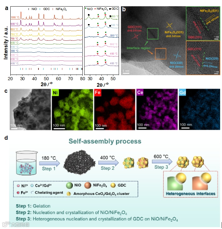 图1. a) 不同煅烧温度下NiFeO-GDC粉末的XRD图谱;b)1000 ℃煅烧的NiFeO-GDC粉末HR-TEM图;c) TEM图及元素分布;d) NiFeO-GDC粉末在煅烧过程中的自组装示意图