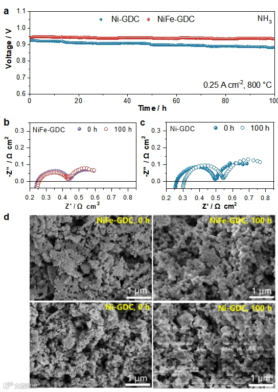 在NH3燃料中,NiFe-GDC单电池表现出优异的运行稳定性,衰减率仅为0.0032%·h−1,表明其对NH3具有优异的耐受性;而Ni-GDC单电池在NH3燃料中电压下降明显,衰减率为0.046%·h−1(图4a)。EIS分析显示,Ni-GDC单电池的衰减主要由RΩ和Rp的增加引起,而NiFe-GDC单电池几乎没有变化(图4b,c)。Ni-GDC阳极在100 h测试后经历了显著的微观结构粗化,且粒子间的接触变差;相比之下,NiFe-GDC阳极微观结构基本保持不变(图4d)。