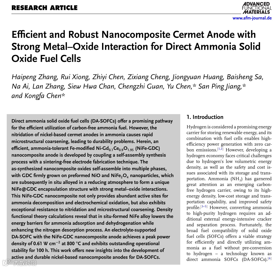 “Efficient and Robust Nanocomposite Cermet Anode with Strong Metal–Oxide Interaction for Direct Ammonia Solid Oxide Fuel Cells”, Adv. Funct. Mater. 2025, 2501223.