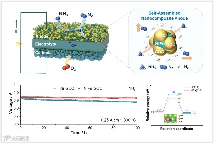 NH3作为一种前景广阔、氢含量高的低成本化学储氢介质,为氢能的储存与运输提供了高效可行的解决路径。固体氧化物燃料电池(SOFC)因其良好的燃料兼容性,可直接利用NH3作为燃料,省去了复杂的H2转化环节。然而,NH3在SOFC中的实际应用仍面临显著挑战,源于传统镍基陶瓷金属阳极在NH3环境中易发生氮化反应,导致阳极微观结构长大粗化,严重影响其长期稳定性。因此,开发一种兼具高电催化活性与优异稳定性的阳极材料,对于实现直接氨燃料电池的高效运行具有关键意义。