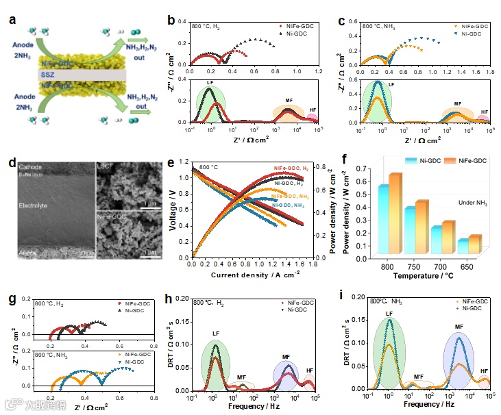 图3. a) NiFe-GDC|SSZ|NiFe-GDC对称半电池在NH3燃料中运行示意图;NiFe-GDC和Ni-GDC对称半电池的EIS曲线和DRT分析:b)H2环境;c) NH3环境;d) 电解质支撑单电池的SEM图像;e)以H2与NH3为燃料的单电池I−V与I−P曲线;f)以NH3为燃料的单电池PPD比较;g) H2和NH3燃料中单电池EIS曲线;h) H2燃料中单电池DRT分析;i) NH3燃料中单电池DRT分析