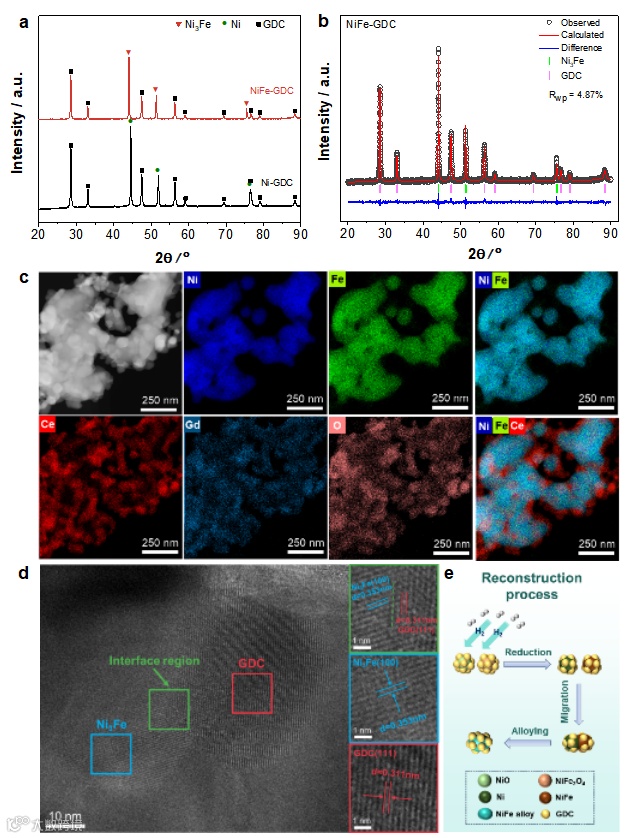 图2. a) 还原后NiFe-GDC和Ni-GDC粉末XRD图谱;b) 精修XRD图谱;c) NiFe-GDC粉末STEM图及元素分布图;d) NiFe-GDC粉末HR-TEM图;e) 还原和合金化过程示意图