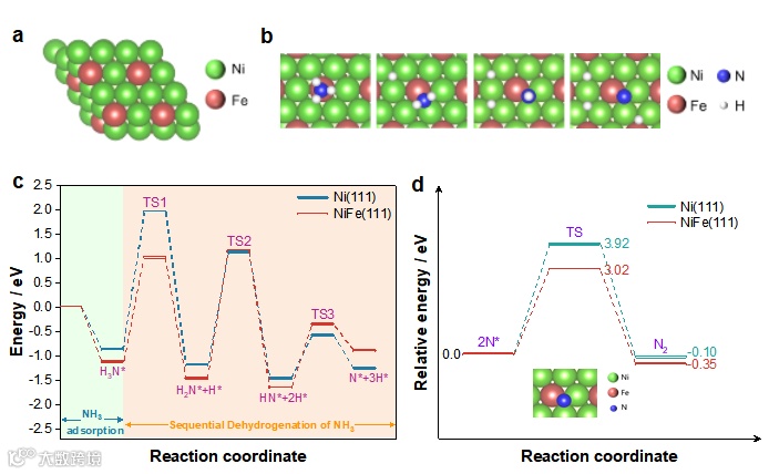 图5. a) NiFe (111)表面吸附模型;b) 中间物种(H3N*, H2N* + H*, HN* + 2H*, N* + 3H*)在NiFe (111)上的最稳定吸附构型;c) NH3分解在NiFe (111)和Ni (111)上的最低能量反应路径。d) 氮脱附路径的DFT研究。展示了最稳定的氮吸附初始状态以及氮脱附路径(2N*→N2 (g) + 2*)示意图。能量相对于反应物(2N*)而言,TS代表联合脱附能垒