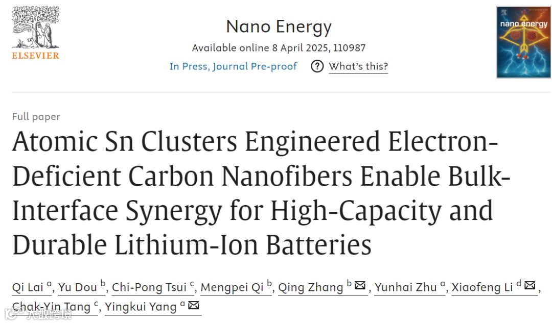 锡团簇调控电子缺陷碳纳米纤维:体相-界面协同助力高容量与长循环锂离子电池