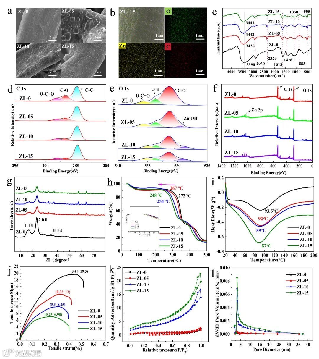 图3. (a) SEM图像。(b) ZL-15膜的EDS分析。(c) FTIR光谱。(d)-(f) 不同Zn2+比例的LC膜的XPS C 1s、O 1s和全谱图。(g) XRD图谱。(h) TGA曲线。(i) DSC曲线。(j) 应力-应变曲线。(k) 氮气吸附-脱附等温线。(l) 孔径分布曲线。